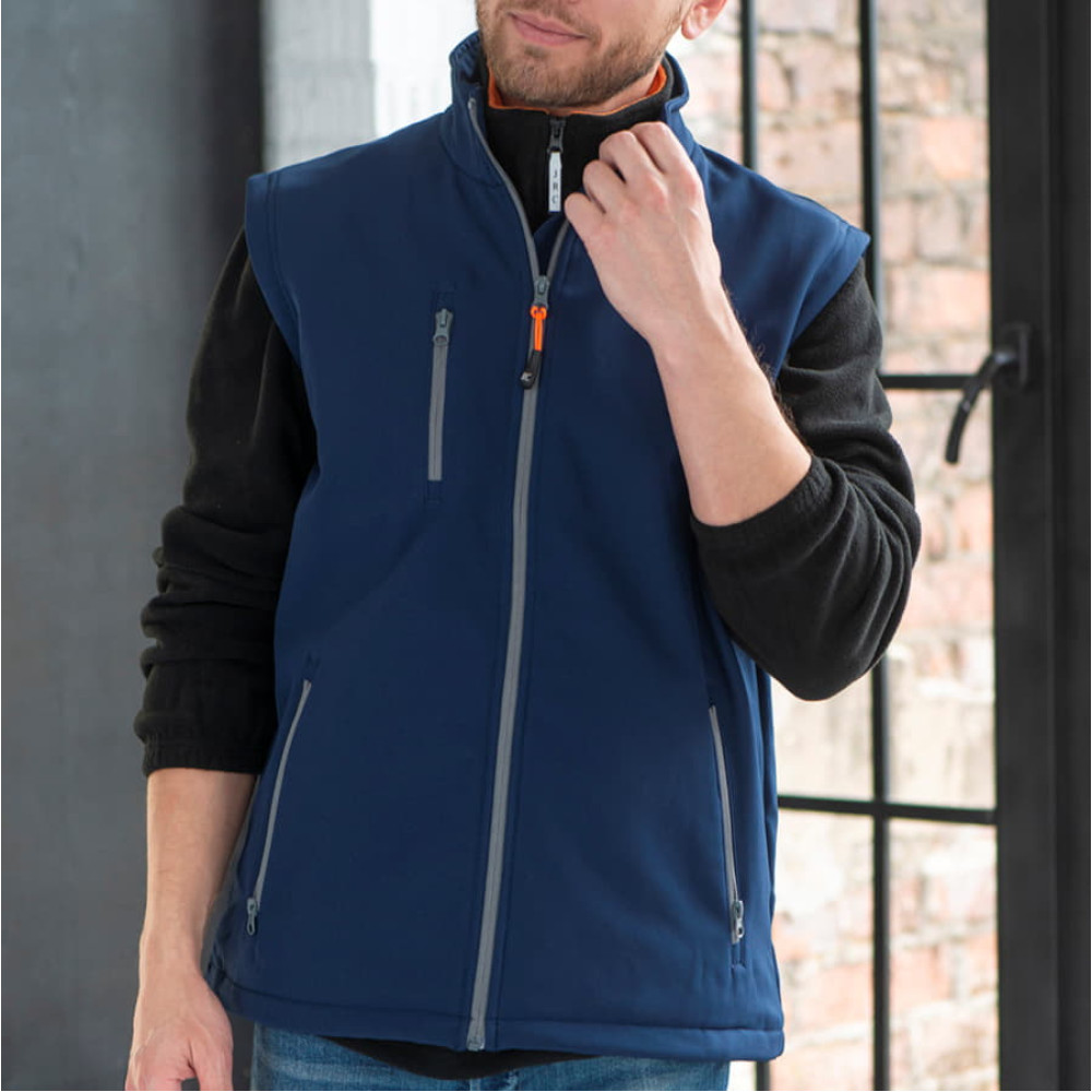Двухслойная ткань softshell. Водонепроницаемый и дышащий мужской жилет. Небольшой воротник-стойка. Обратная контрастная пластиковая молния со съемным пуллером. Один нагрудный и два боковых кармана с обратной молнией. Утягивающий шнурок по низу жилета.