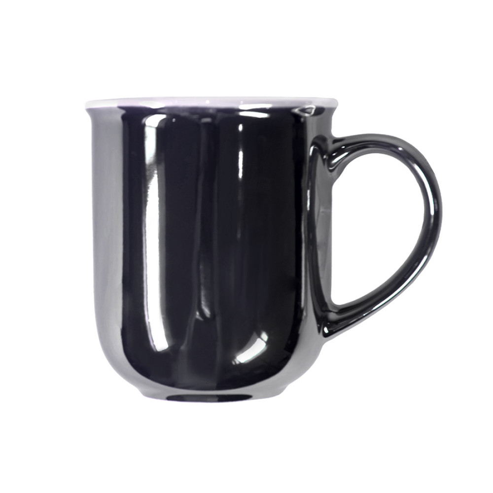 Кружка необычной, скругленной внизу формы, дополнена белым кантом по верхнему краю и актуальным покрытием с жемчужным блеском или эффектом перламутра.