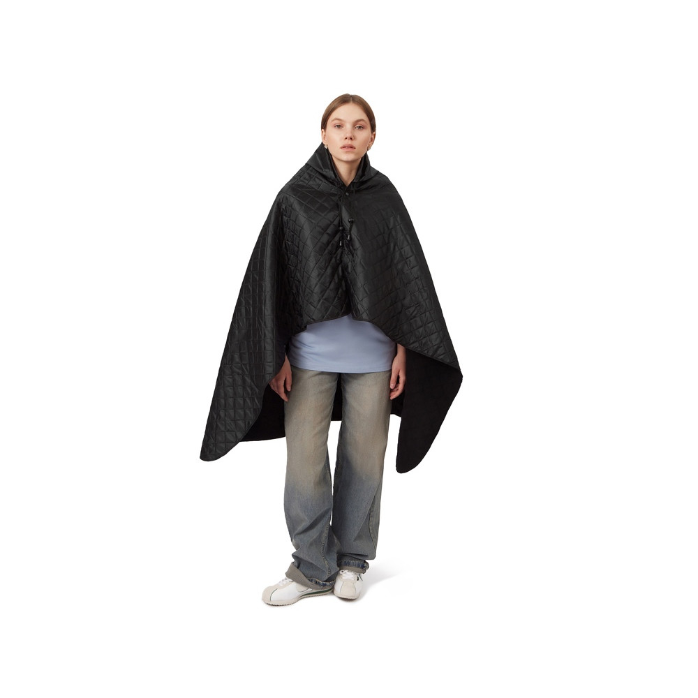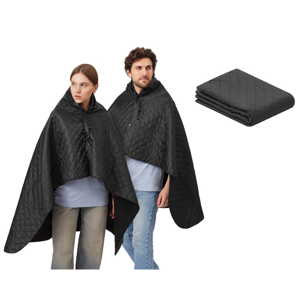 На внутренней стороне из флиса приятно и тепло сидеть, а наружная сторона из полиэстера с водоотталкивающим покрытием не позволяет пледу намокнуть или сильно испачкаться. Для больше удобства использования пледа во время дождя в комплекте идет капюшон, который фиксируется с помощью липучки. Накинув плед на плечи, застегните его на кнопки вверху и наденьте капюшон. Вы не промокните во время неожиданного дождя!