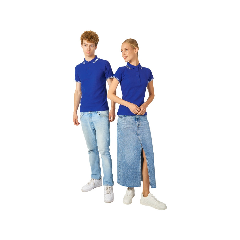 Рубашка-поло Erie с окантовкой. Воротник и манжеты резинка 1х1. Мужская модель с двумя пуговицами, женская - 4 пуговицы в тон изделия. Обшивка внутри воротника. Женская модель с разрезами по бокам. Женская модель приталена. Пике, 100% чесаный хлопок. Плотность 180 г/м2.