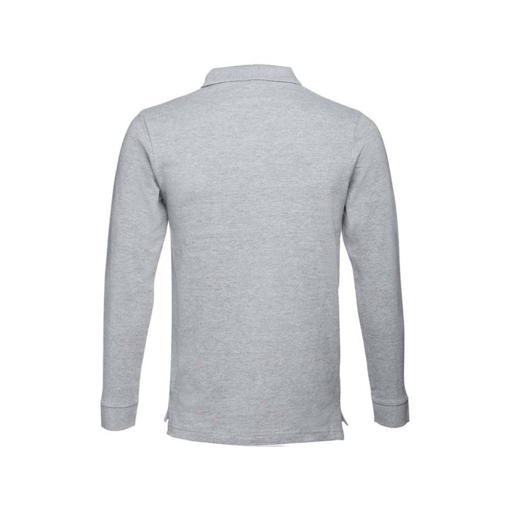 Мужская рубашка-поло с длинным рукавом из хлопковой ткани-пике. Полотно футболки упругое и гладкое благодаря обработке ферментами "enzyme wash" и сохраняет форму при стирке. Модель полуприлегающего силуэта. Благодаря манжете из риба 1х1 рукав смотрится очень аккуратно. Воротник также выполнен из риба 1х1, внутри ворота - укрепляющая тесьма по горловине. Планка с 3 пуговицами в цвет основной ткани изделия. Запасная пуговица на ярлыке во внутреннем боковом шве.