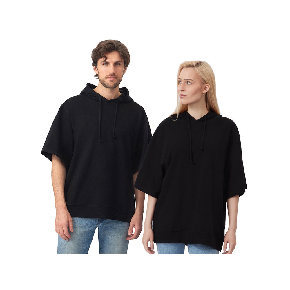 Худи с коротким рукавом выполнено из хлопкового френч терри с петельками на изнаночной стороне. Подкладка капюшона выполнена из основного полотна для объемной посадки. Модель комфортной и актуальной посадки оверсайз отлично подходит для обычной жизни и в качестве промо мерча.