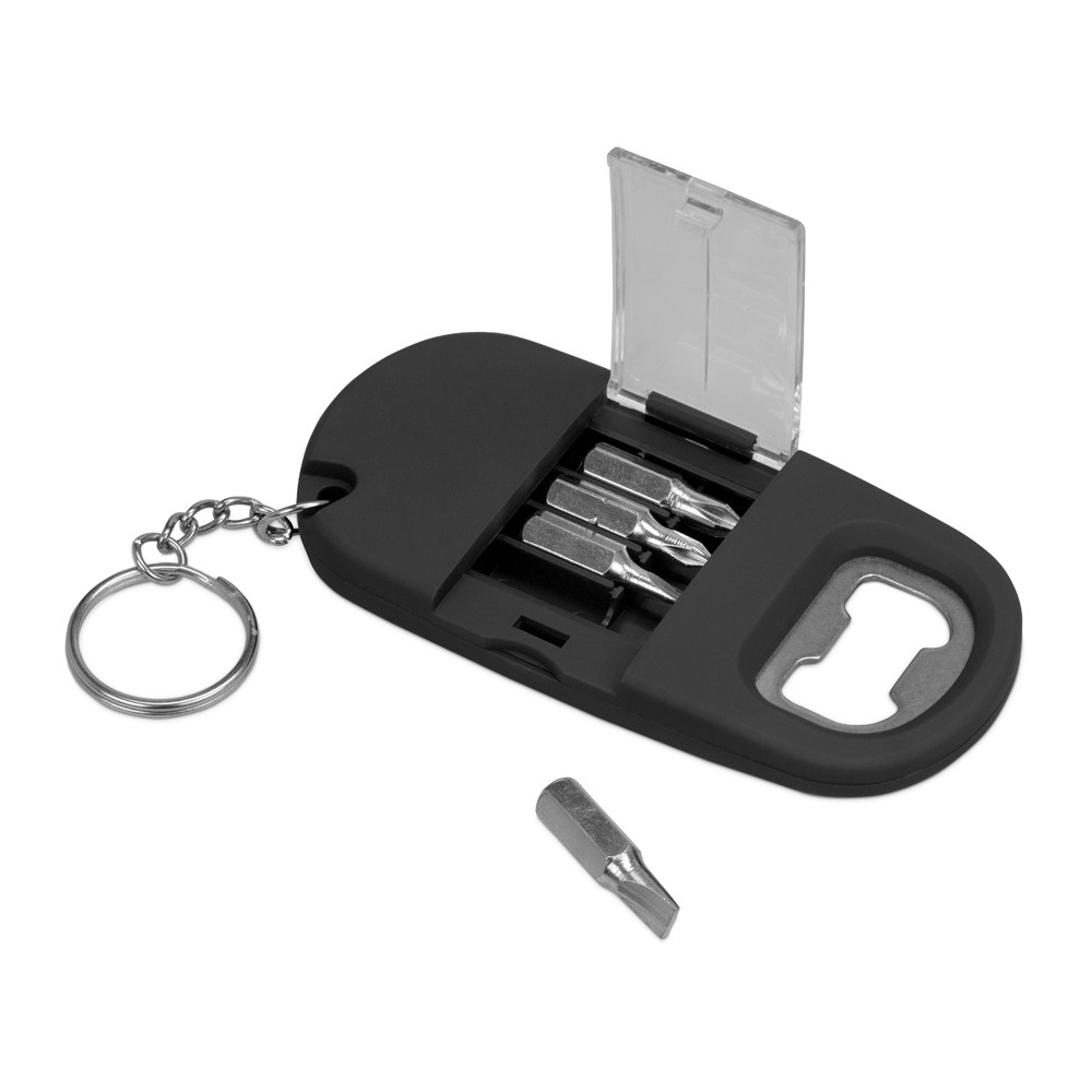 Брелок включает в себя 2 плоские и 2 крестообразные насадки, прочную металлическую открывалку и небольшой фонарик. Корпус сделан из плотного пластика с мягким покрытием soft-touch. Встроенный фонарик позволяет подсвечивать рабочую зону.