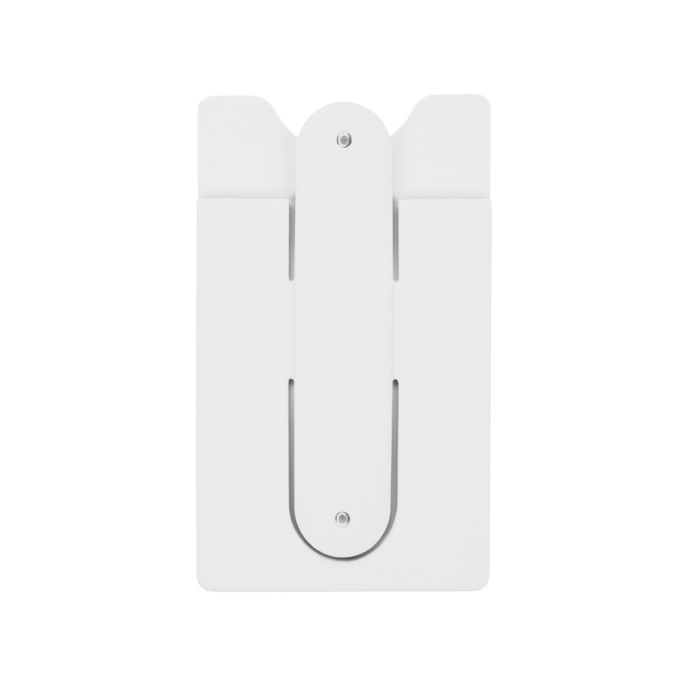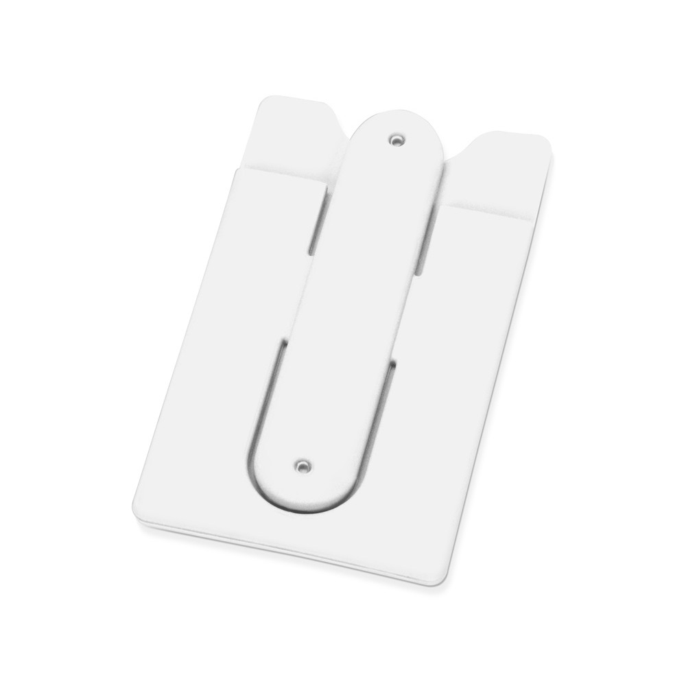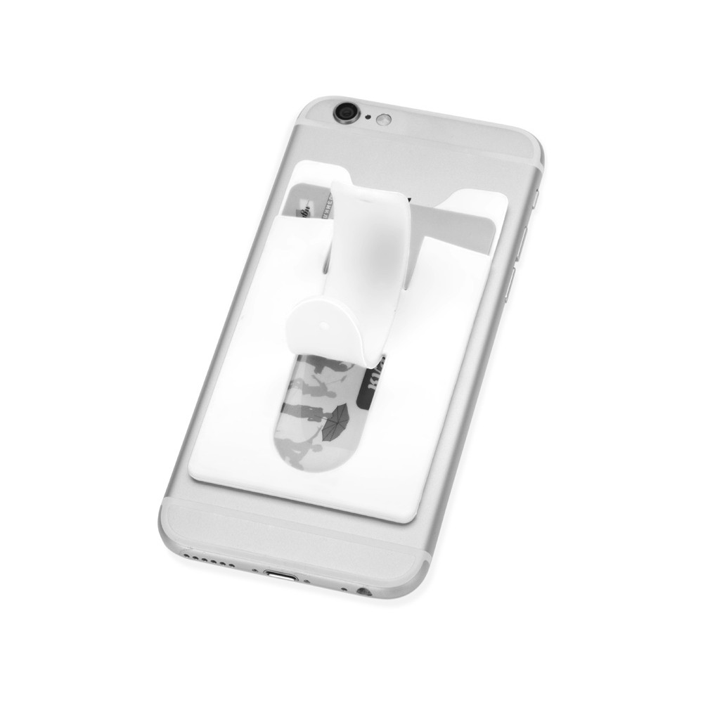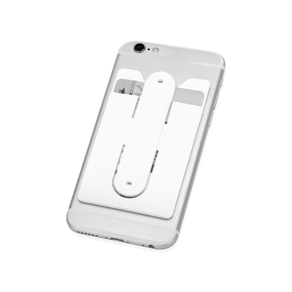 Чехол для визиток и кредитных карт с функцией подставки. За счет клейкой основы прикрепляется к обратной стороне телефона или любой другой плоской поверхности.