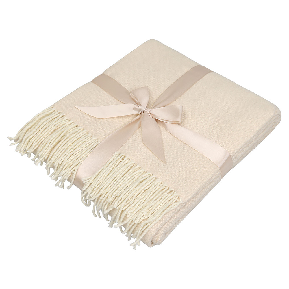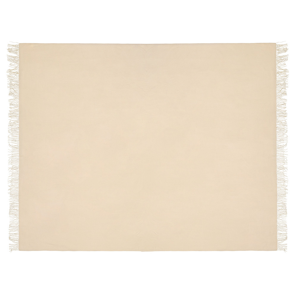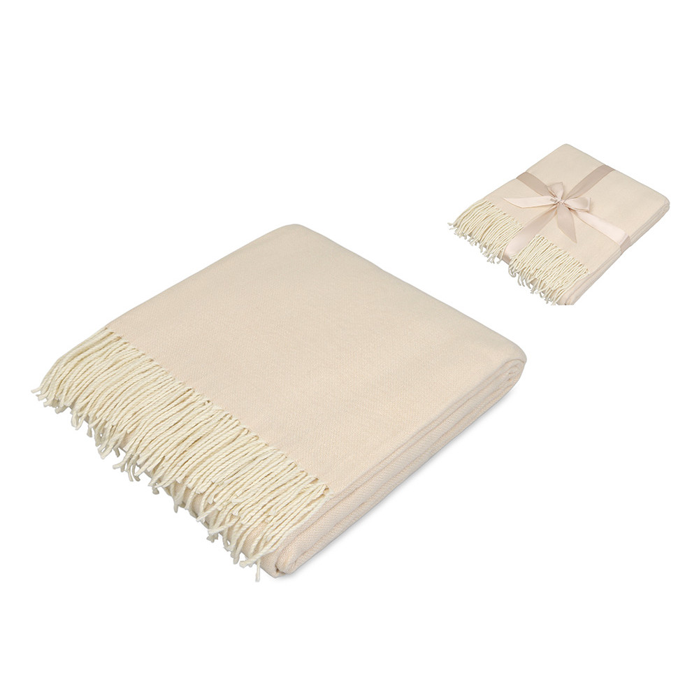 Большой размер этого мягкого плотного пледа позволяет использовать его как одеяло и как покрывало, украшающее интерьер. По бокам плед украшен бахромой. В комплекте идет упаковочная бежевая лента, на которой можно сделать нанесение.