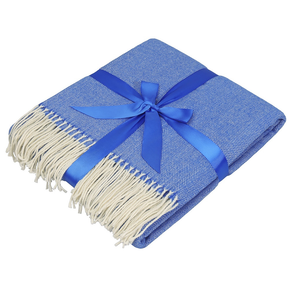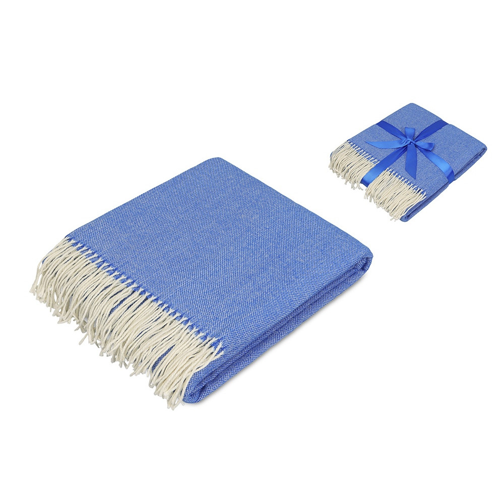 Большой размер этого мягкого плотного пледа позволяет использовать его как одеяло и как покрывало для вашего интерьера. По бокам плед украшен бахромой. В комплекте идет упаковочная синяя лента, на которой можно сделать нанесение вашего логотипа.