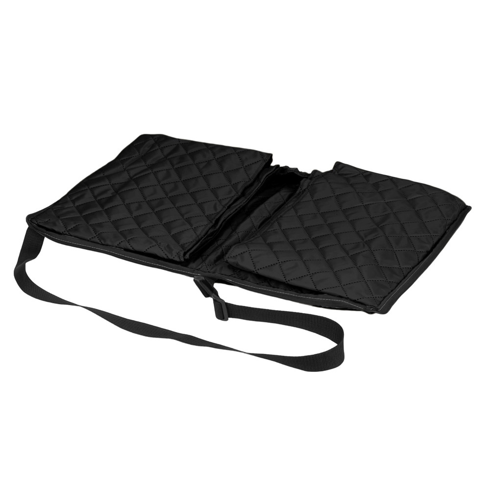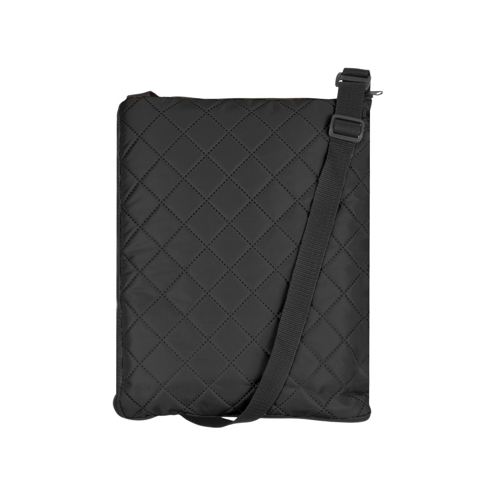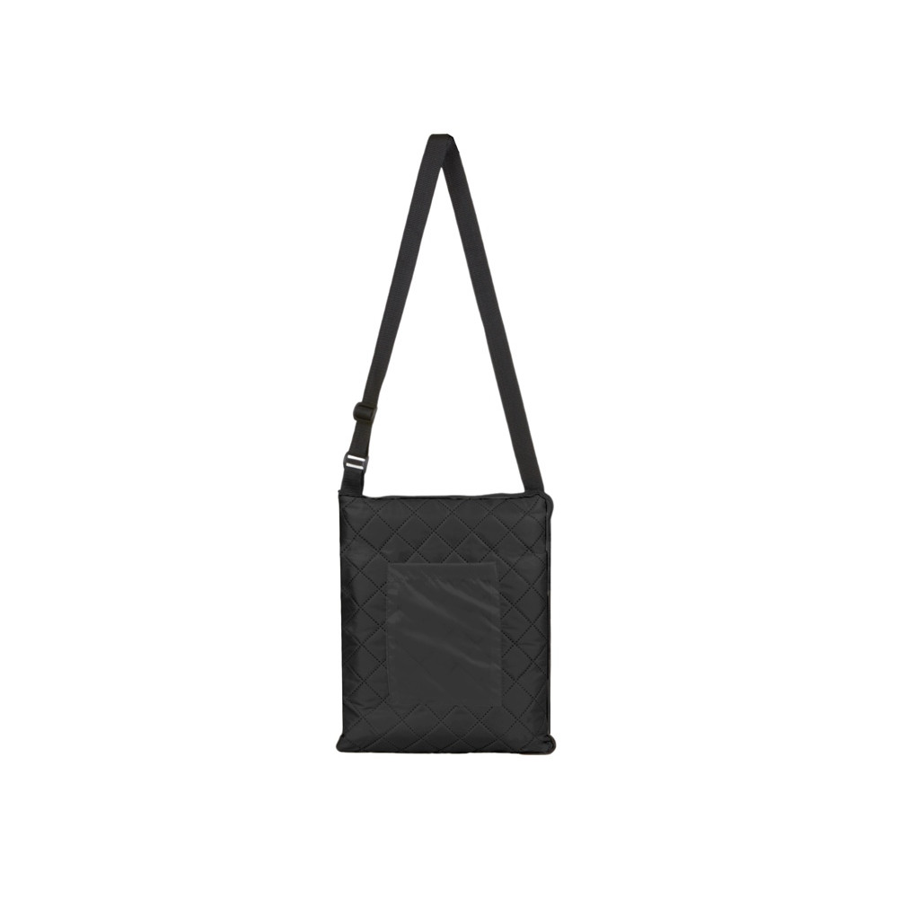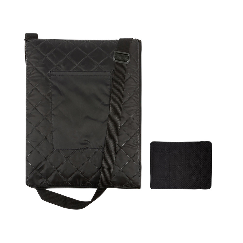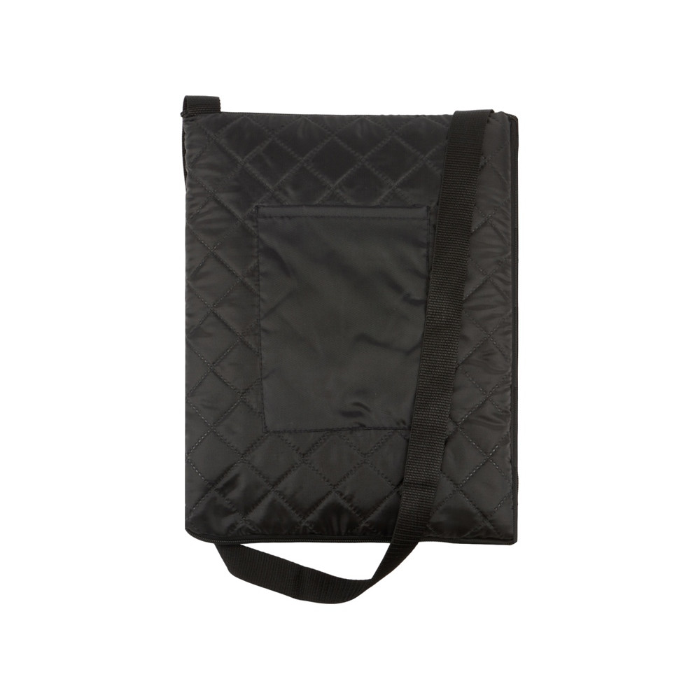 Двухсторонний плед с водоотталкивающим покрытием с одной стороны и мягким флисом с другой. Складывается в сумку на плечо и фиксируется с помощью молнии. В собранном виде имеет регулируемый по длине ремень для переноски и наружный карман для мелочей.