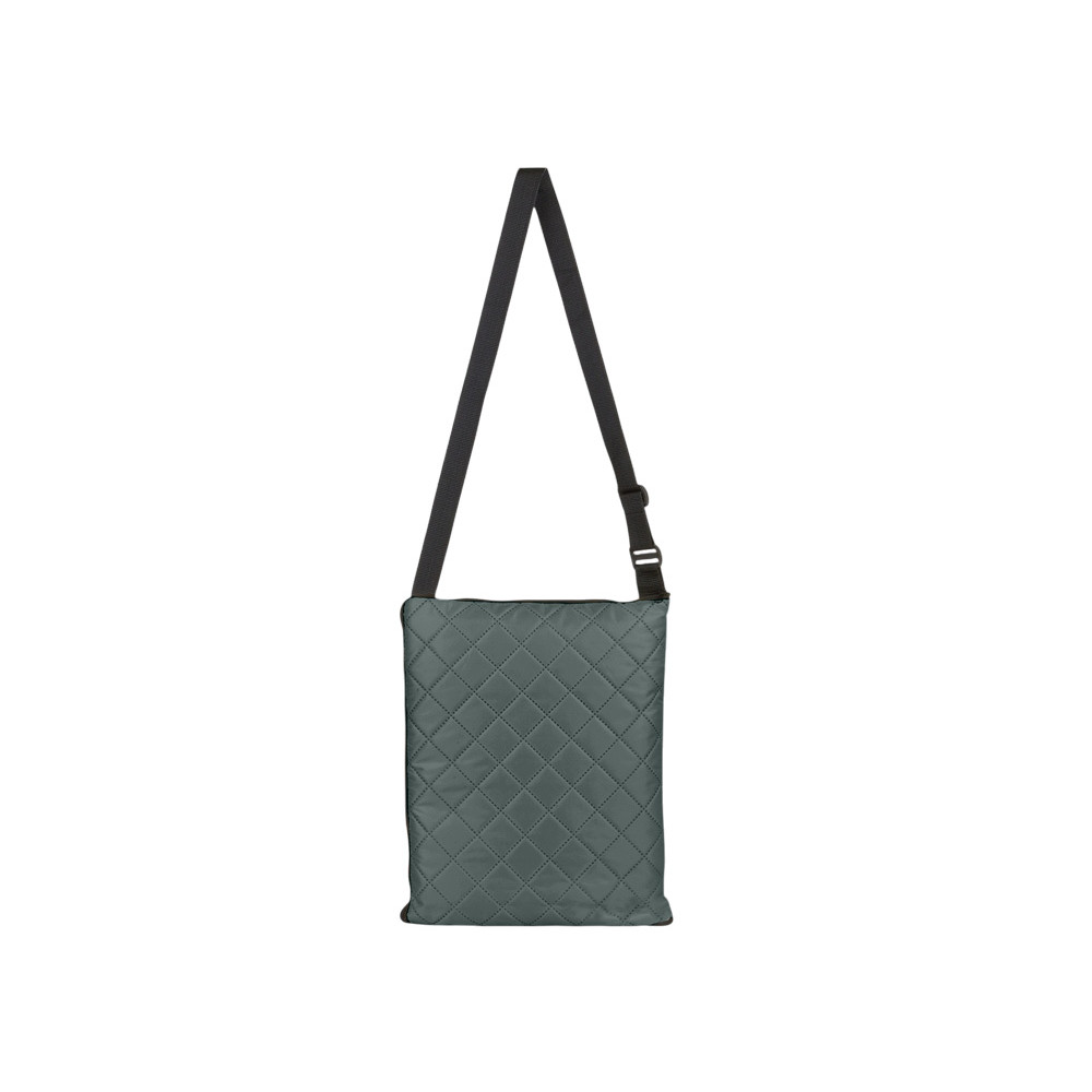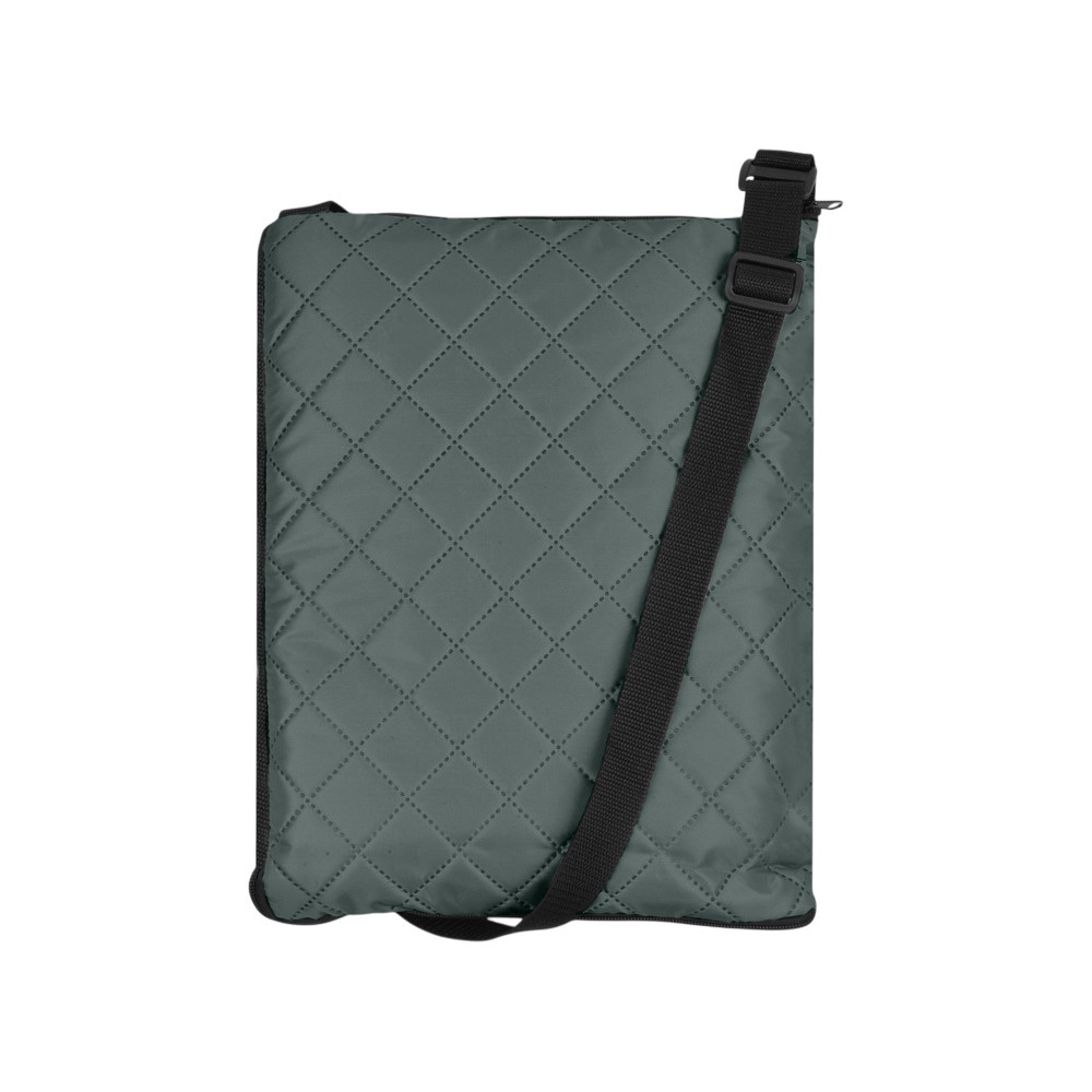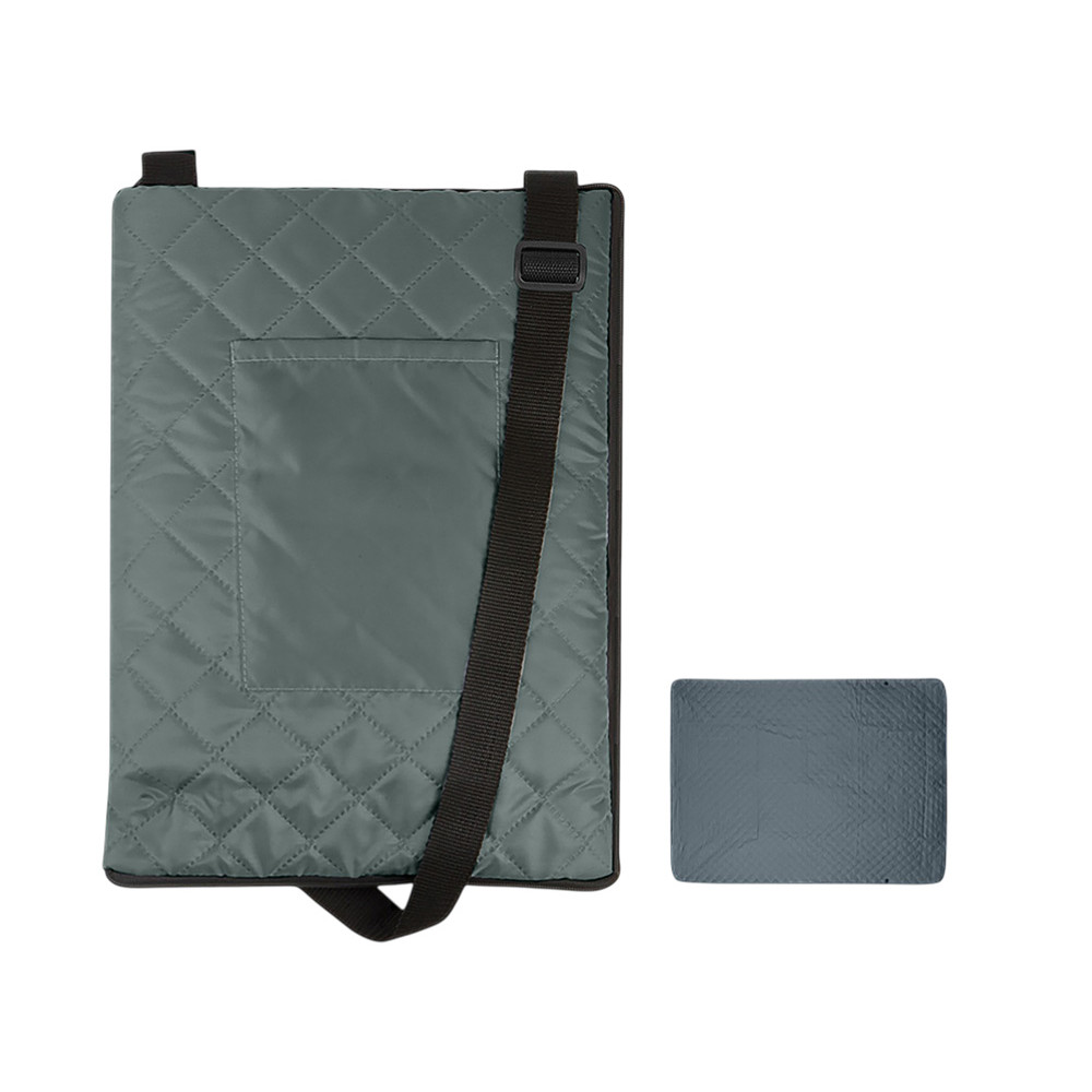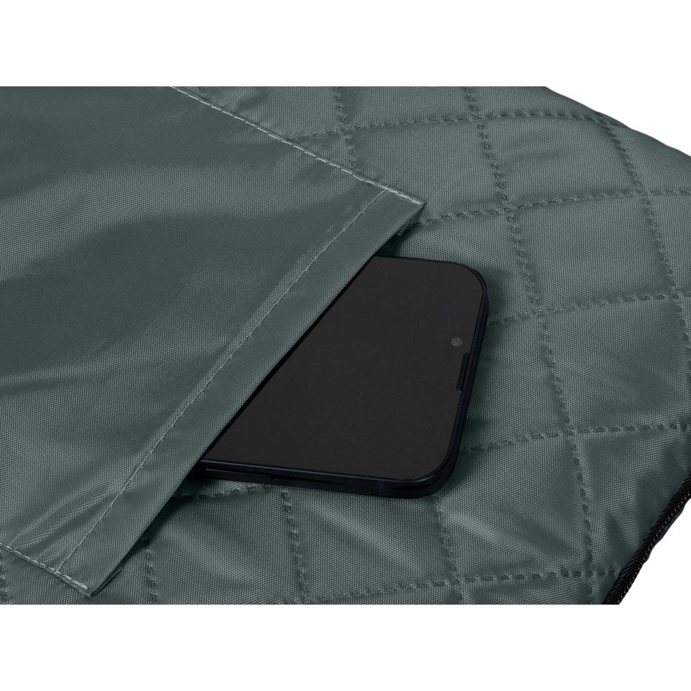 Двухсторонний плед с водоотталкивающим покрытием с одной стороны и мягким флисом с другой. Складывается в сумку на плечо и фиксируется с помощью молнии. В собранном виде имеет регулируемый по длине ремень для переноски и наружный карман для мелочей.