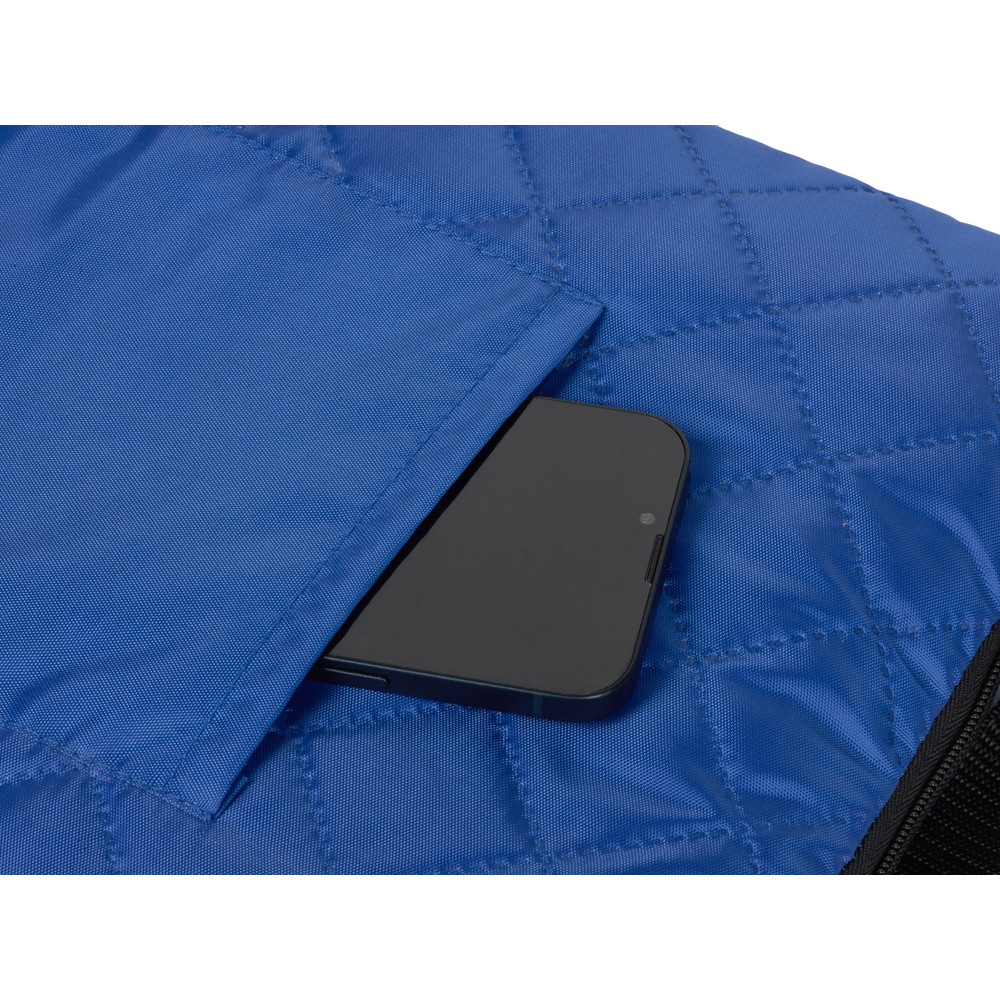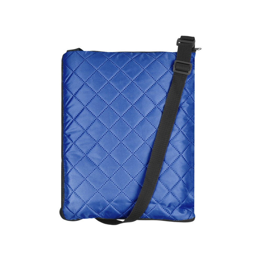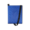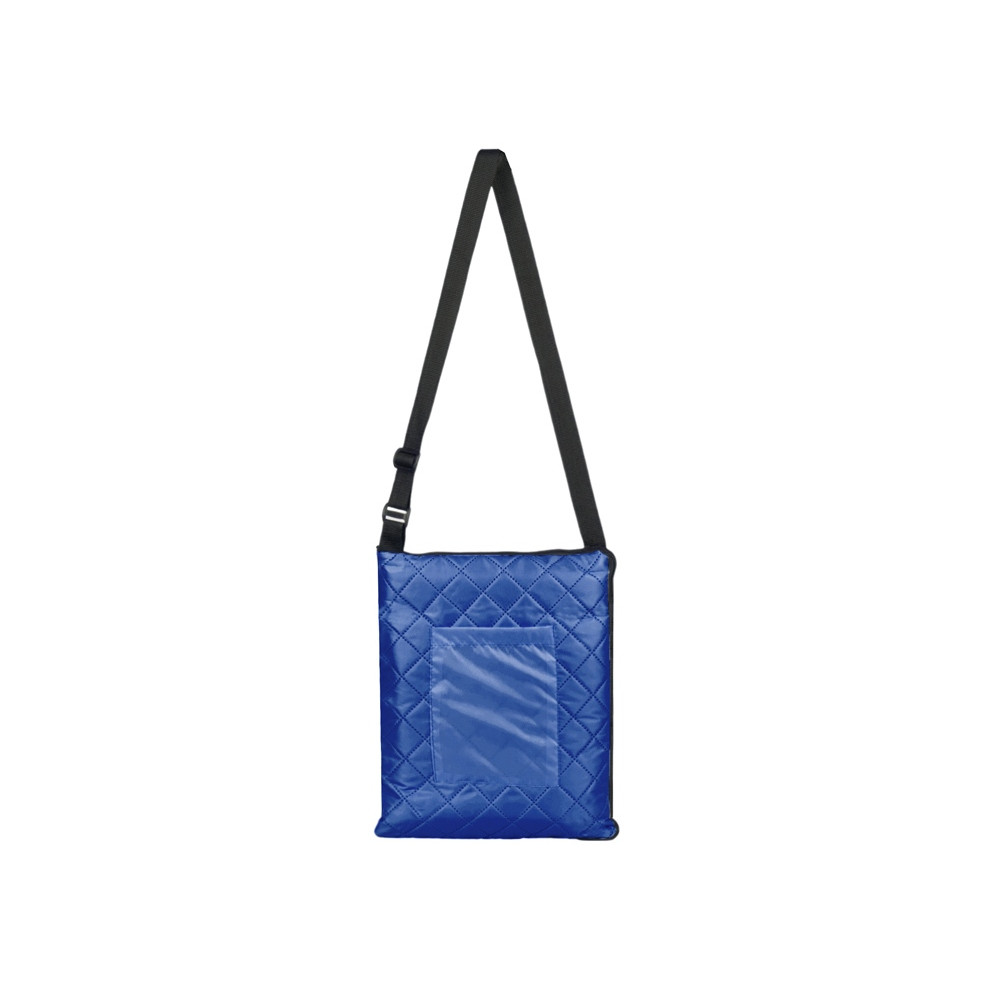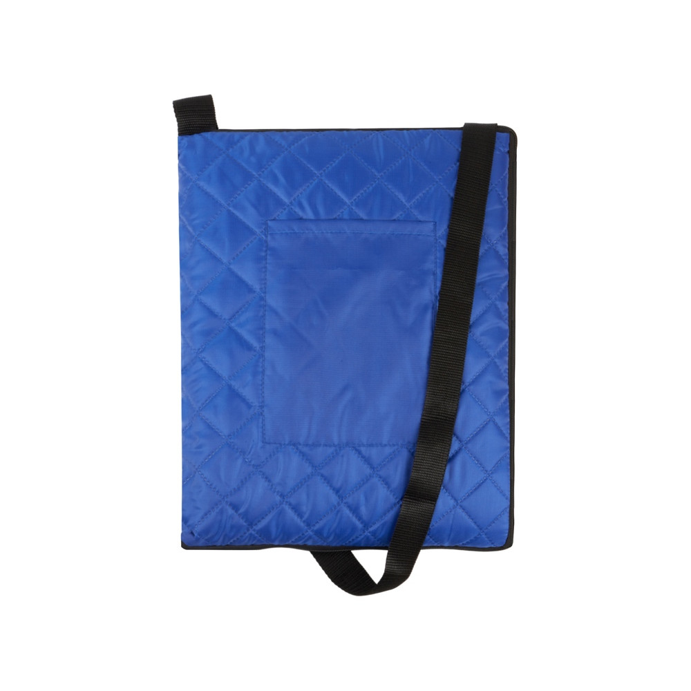 Двухсторонний плед с водоотталкивающим покрытием с одной стороны и мягким флисом с другой. Складывается в сумку на плечо и фиксируется с помощью молнии. В собранном виде имеет регулируемый по длине ремень для переноски и наружный карман для мелочей.
