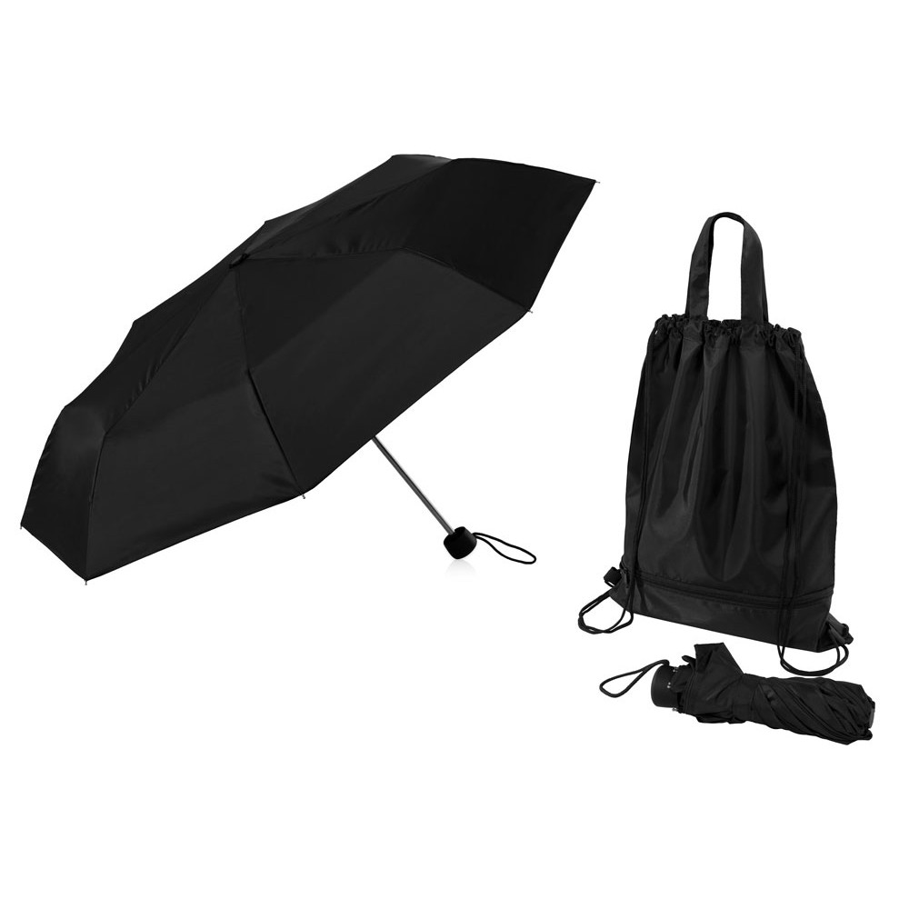 Механический зонт с прорезиненной ручкой идет в комплекте с сумочкой для покупок. На дне сумочки предусмотрен карман на молнии, в котором вы можете хранить зонт дома или прятать в него мокрый зонт, когда вы попали под дождь. Находясь в кармане сумочки, мокрый зонт не доставит неудобств. Сумочка имеет 2 варианта использования: шопер с двумя 2 ручками и рюкзак-мешок со шнурками.