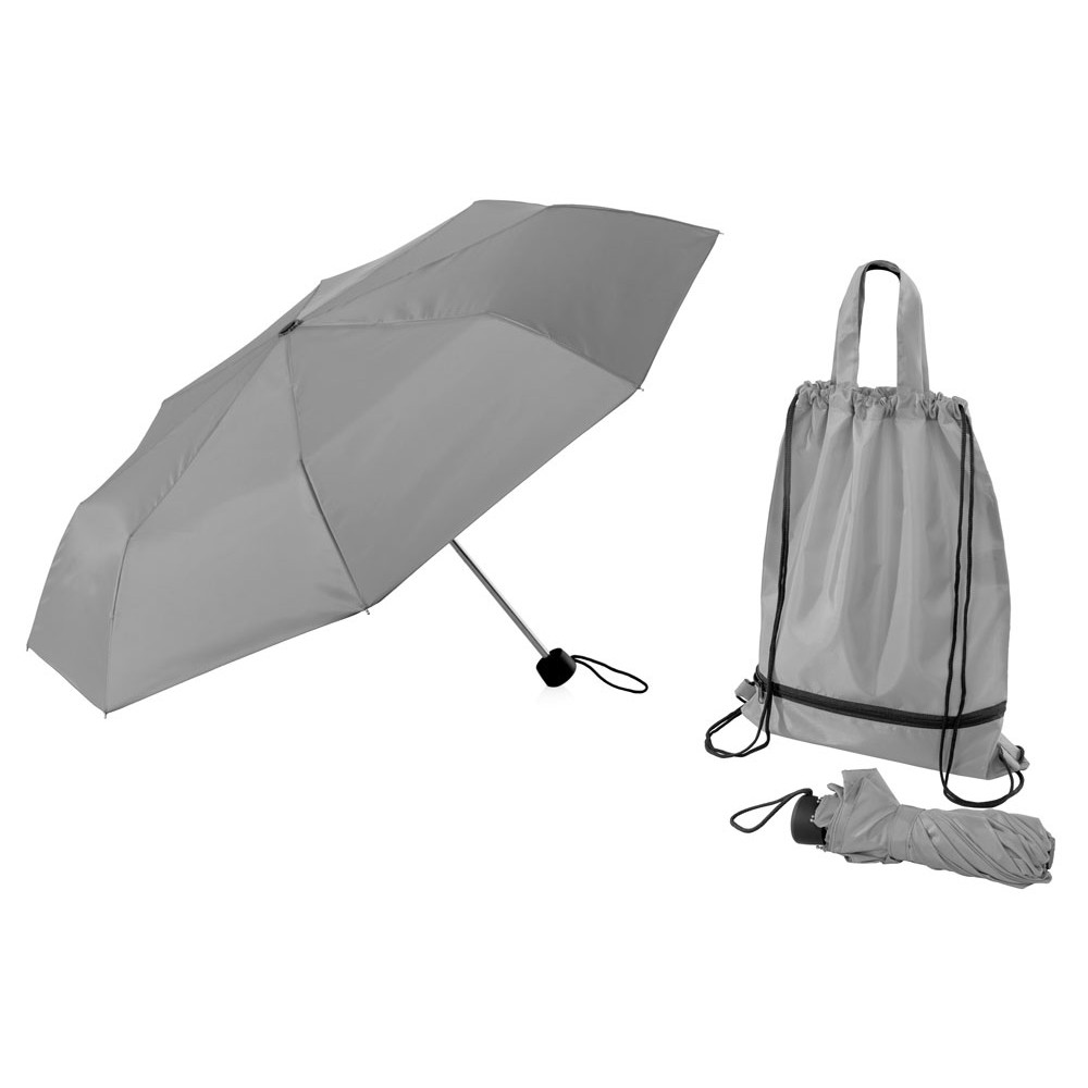 Механический зонт с прорезиненной ручкой идет в комплекте с сумочкой для покупок. На дне сумочки предусмотрен карман на молнии, в котором вы можете хранить зонт дома или прятать в него мокрый зонт, когда вы попали под дождь. Находясь в кармане сумочки, мокрый зонт не доставит неудобств. Сумочка имеет 2 варианта использования: шопер с двумя 2 ручками и рюкзак-мешок со шнурками.