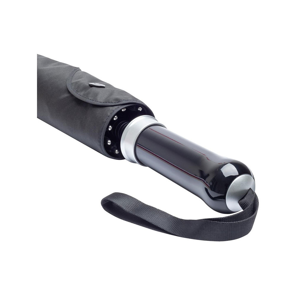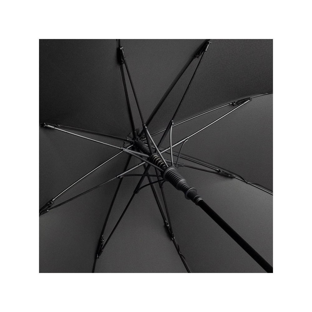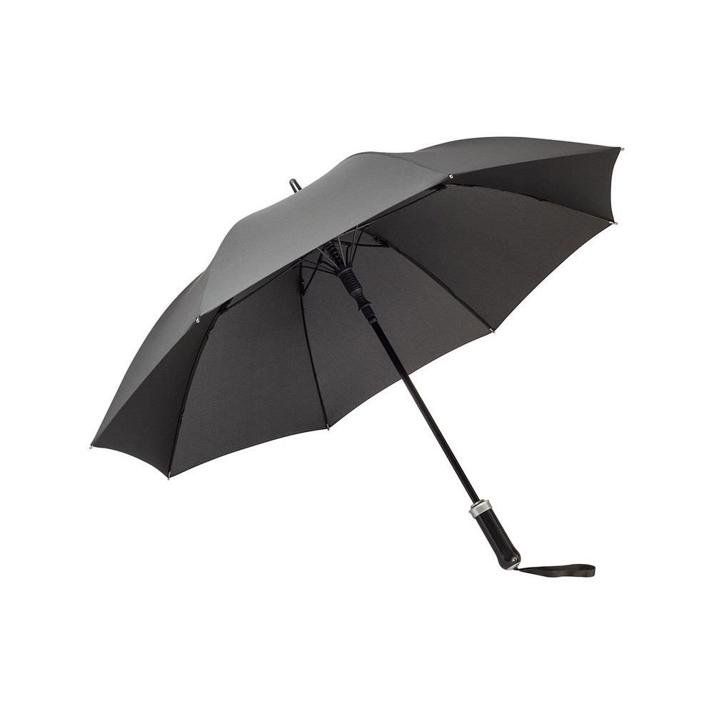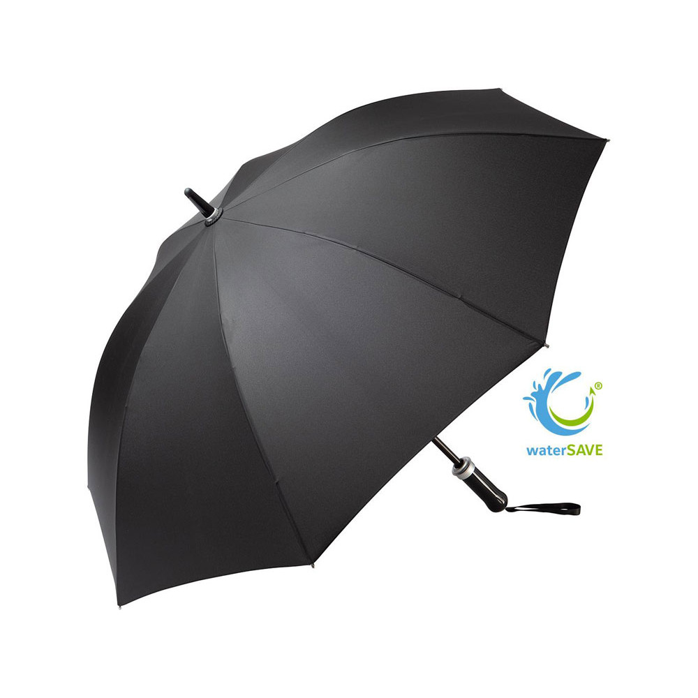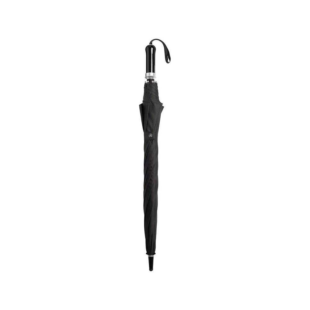 Удобный автоматически открывающийся зонт-трость с уникальной функцией быстрого открытия - нужно потянуть вниз металлическое кольцо на ручке. Купол зонта изготовлен из эпонжа из переработанного пластика, с использованием технологии WaterSAVE, когда окрашивание материала происходит в процессе производства, за счет чего снижает потребление электроэнергии и воды. Высококачественная система защиты от ветра в штормовых условиях обеспечивается гибкими спицами из стекловолокна. Ручка глянцево-черного цвета с хромированными вставками и петлей для переноски. В комплекте чехол, застегивающийся на кнопку.