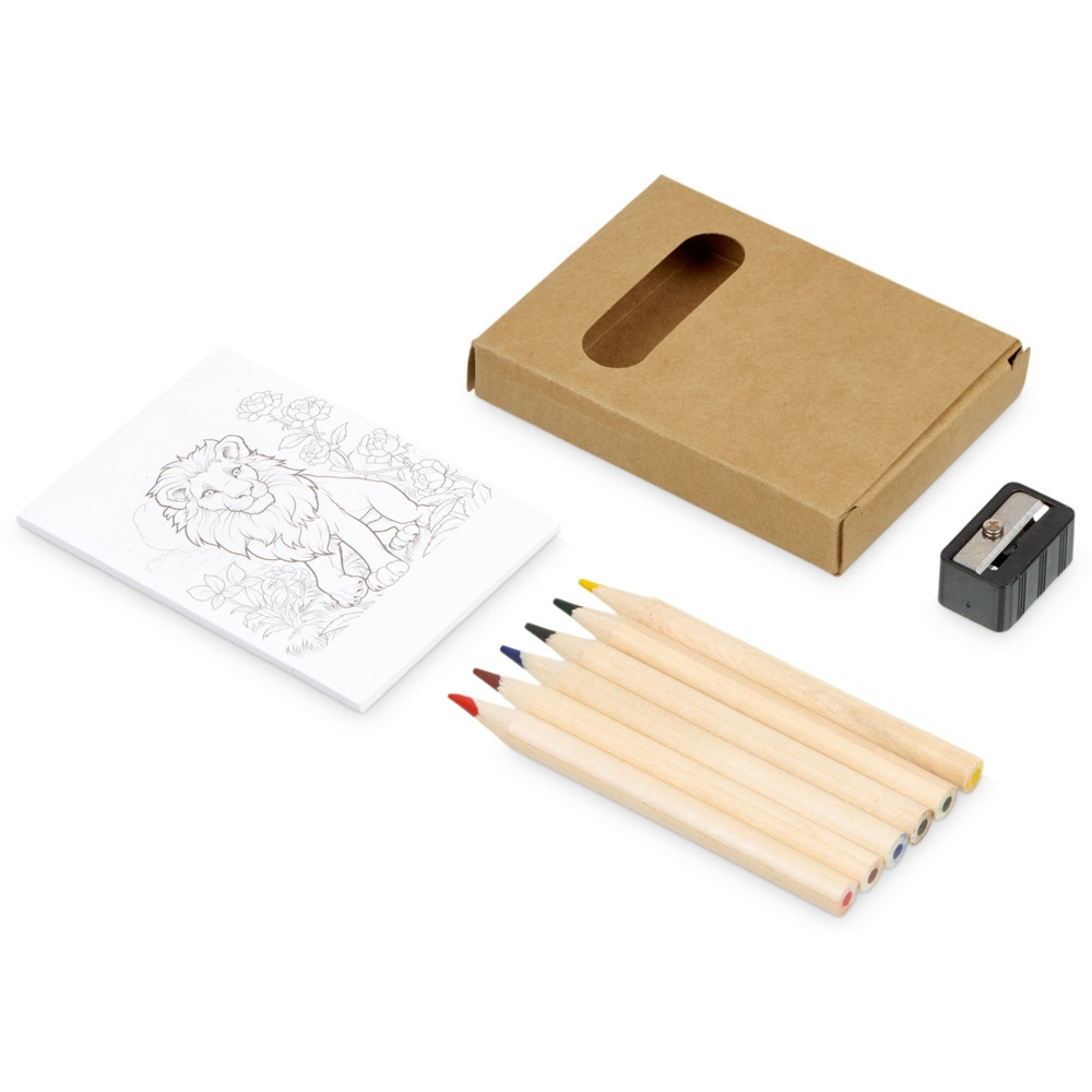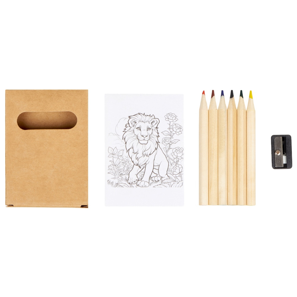 Небольшой набор для рисования станет отличным промо-сувениром. В наборе 6 цветных карандашей, точилка и раскраска с изображениями животных. Набор поставляется в картонной коробке.