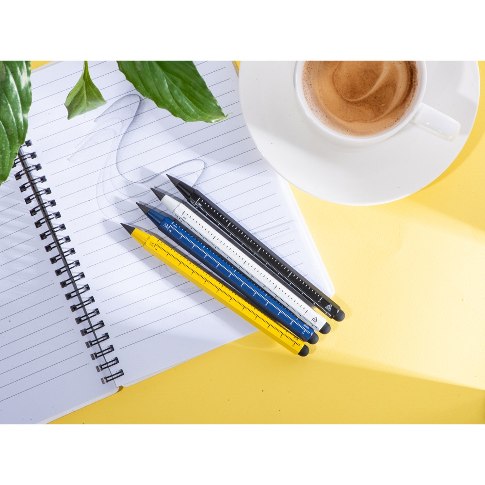 Карандаш изготовлен из переработанного алюминия. В отличие от обычных карандашей его не нужно точить, и он не пачкает руки.