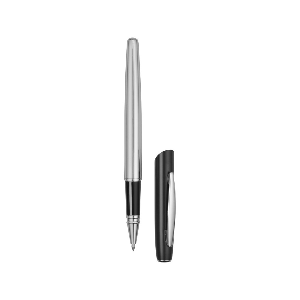 Изящная ручка-роллер с матовой верхней частью и блестящей хромированной нижней частью и соответствующими хромированными вставками.