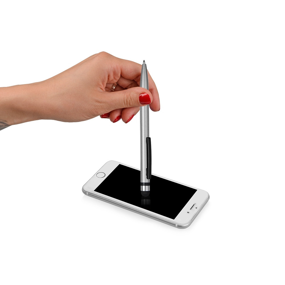 Пластиковая ручка со стилусом. Удачное расположение поворотного механизма предотвращает от случайного появления стержня во время использования стилуса, при этом оставляя большое поле под нанесение на корпусе. Идеальная пара для любого смартфона!