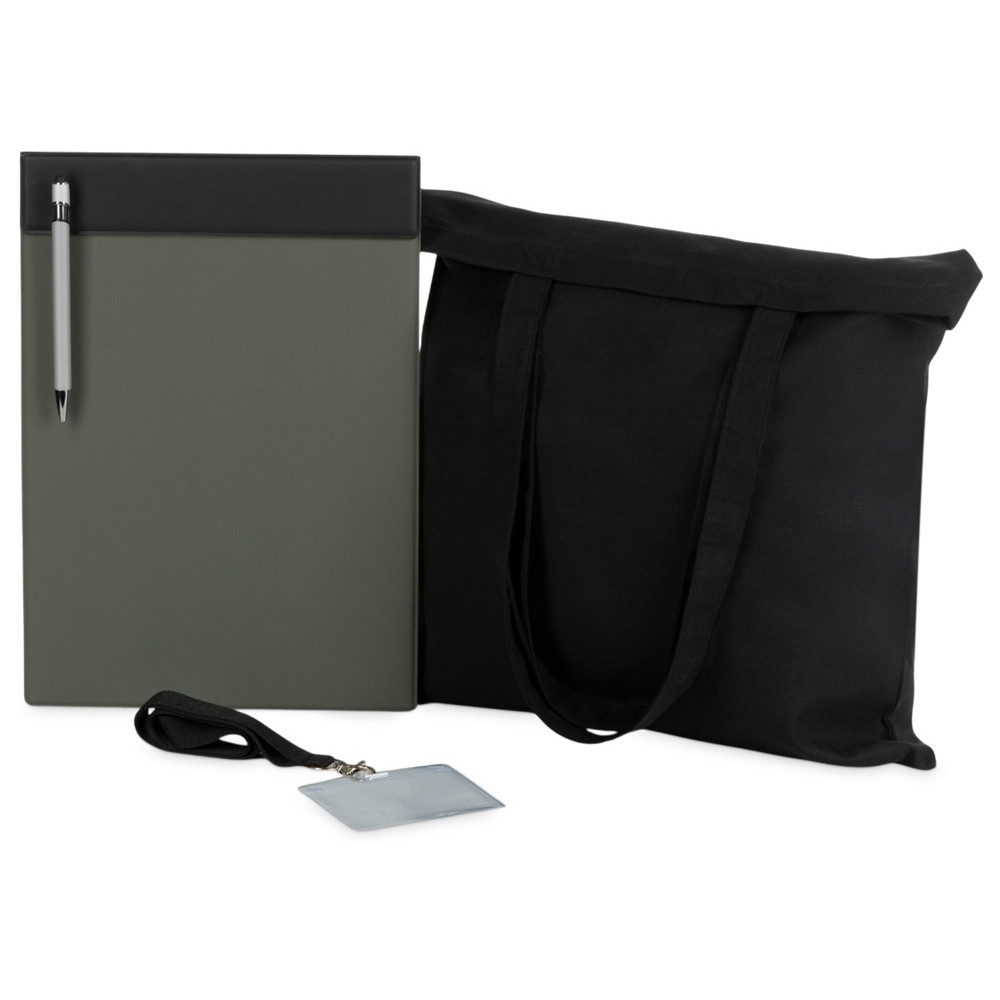 Базовый набор для конференций. В наборе: магнитный планшет для бумаг, ручка для записей, ланъярд и чехол для бейджа участника и шоппер, в который все можно удобно сложить.