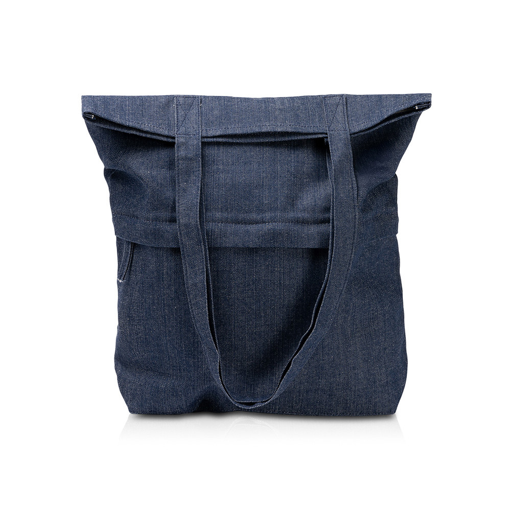 Сумка из переработанной джинсовой ткани с передним карманом на застежке. Высота ручек 29 см.