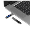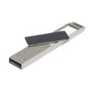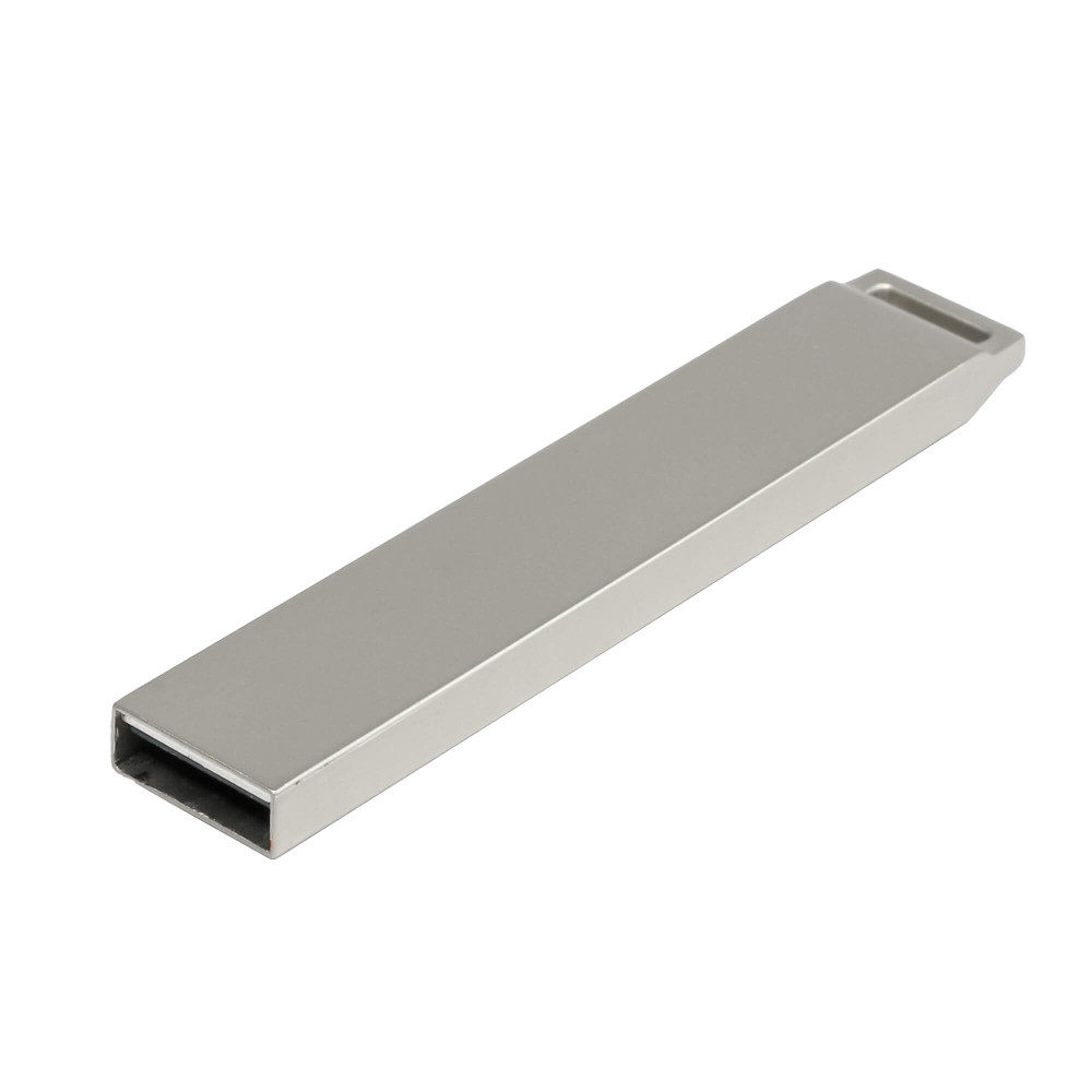 Металлическая флешка с пластиковым шильдом. В зависимости от модели флешки, логотип, выполненный методом лазерной гравировки на шильде подсвечивается синим или белым цветом.