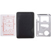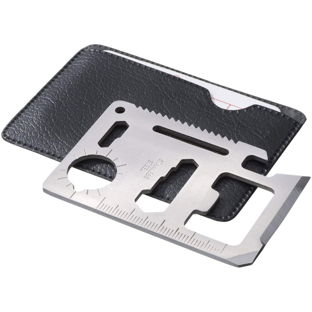 Многофункциональная карта. 11 функций в одной карте - нож, консервный нож, отвертка, линейка, открывалка, 2-х и 4-х позиционный гаечный ключ, разводной гаечный ключ, режущий диск, брелок, указатель направления. Чехол из кожзаменителя.