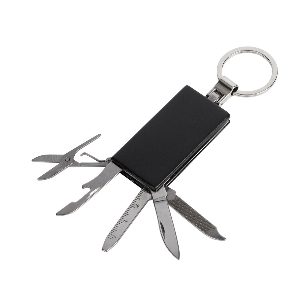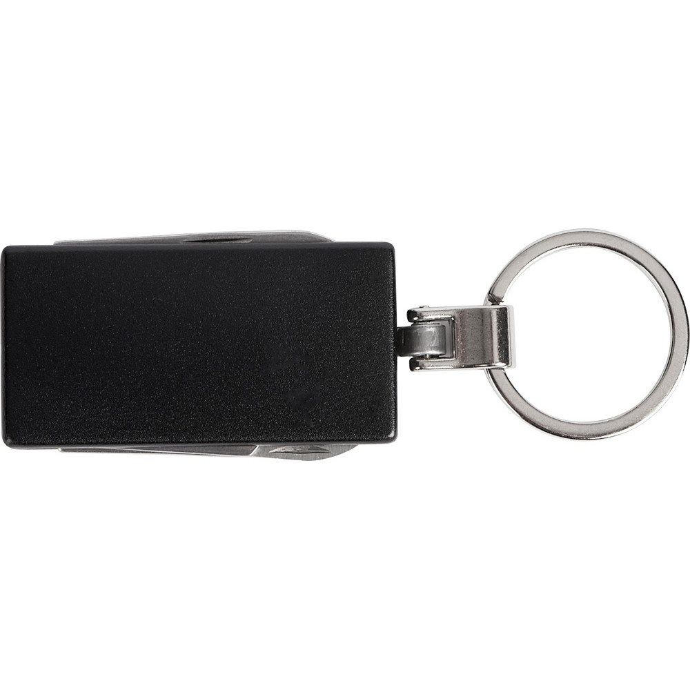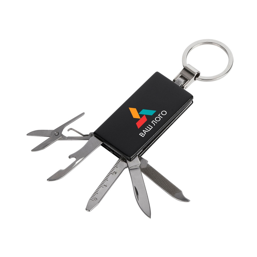 Брелок-мультитул на кольце в металлическом корпусе с заметным полем под нанесение.