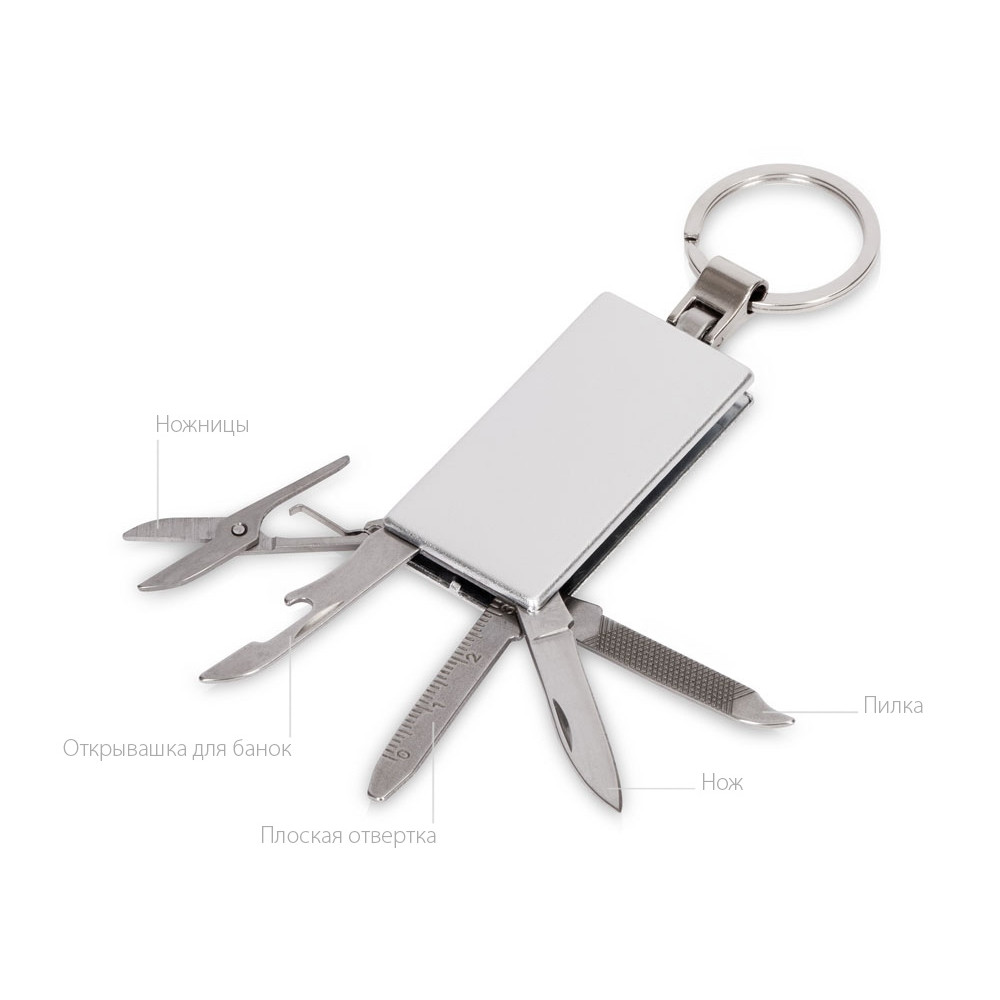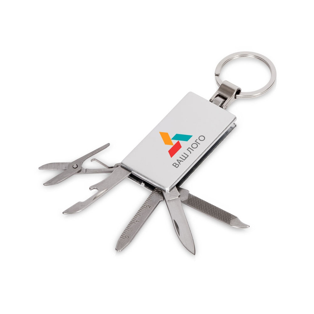 Брелок-мультитул на кольце в металлическом корпусе с заметным полем под нанесение.