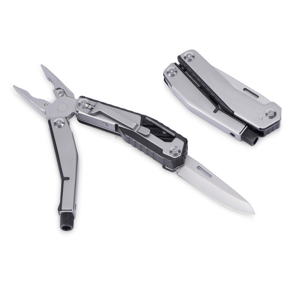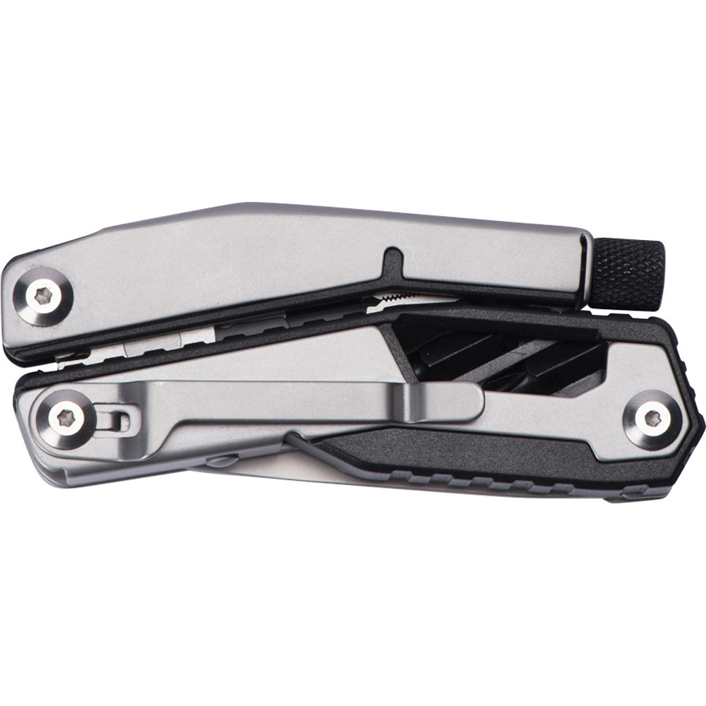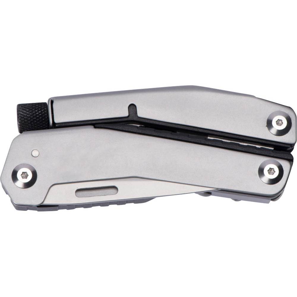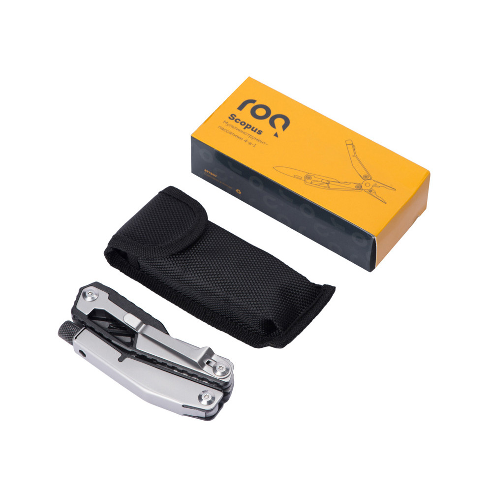 Складной нож Scopus от roq выполнен в ассиметричном необычном дизайне, в его составе — среднего размера нож, пассатижи, плоская и крестовая отвертки (биты), шестигранный ключ 5 мм.