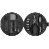 Набор из 25 инструментов включает измерительную мини рулетку, крестообразную отвертку, плоскую отвертку, 9 насадок с адаптером (4 крестообразных шлицев, 2 плоских шлица и 3 шестигранных шлица), 3 шестигранных ключа, 5 головок (5-9 мм), острогубцы, рукоятку отвертки, адаптер для насадок и удобный футляр.