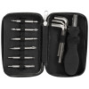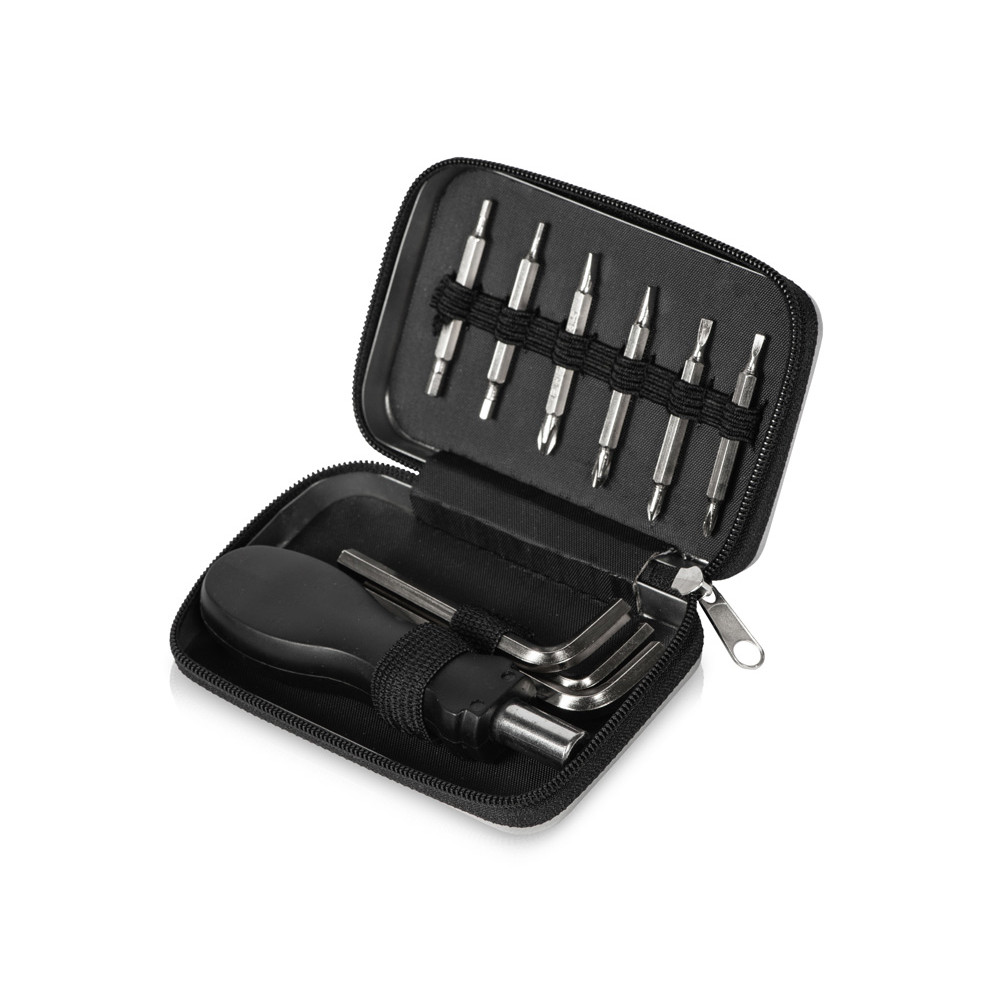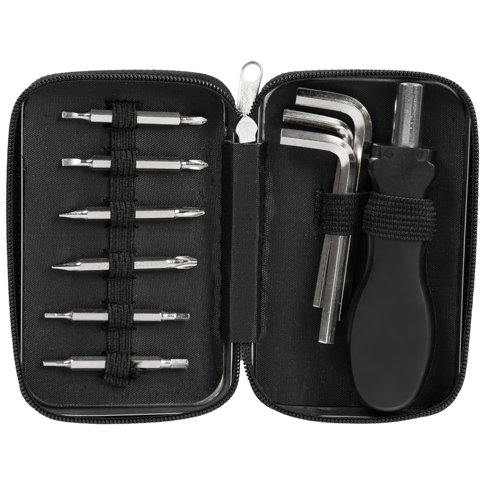 Этот компактный набор содержит 15 инструментов: 3 шестигранных ключа, 6 двухсторонних насадок с битами и ручки к ним. Весь набор компактно упакован в футляр с фиксирующими резинками, которые удерживают инструменты на створках.