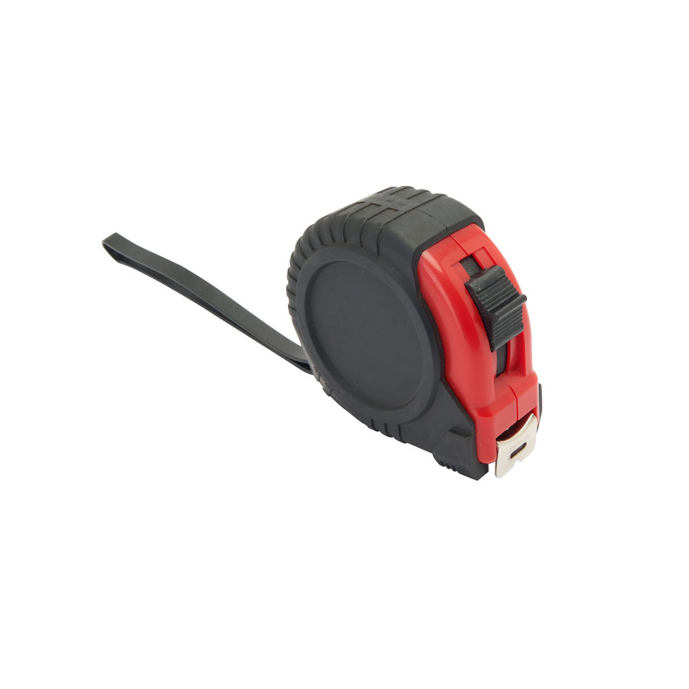5-метровая рулетка с фиксирующим механизмом. Цветной прорезиненный корпус с резиновым чехлом, металлический зажим и ремешок для переноски.