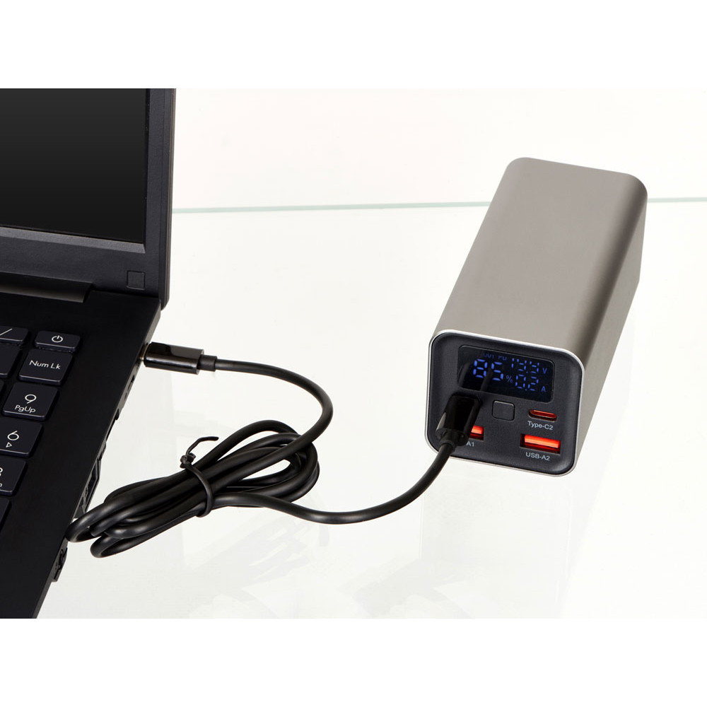 Надежный аккумулятор в металлическом корпусе, который снабжен многоуровневой защитой от скачков напряжения и коротких замыканий. Предназначен не только для ноутбуков*, но и может супер быстро зарядить планшеты и смартфоны (можно подключить до 4-х устройств). Уровень заряда отображается на дисплее, на котором также отображаются текущие напряжение и сила тока. Быструю зарядку теперь можно увидеть в прямом эфире. Кабель с поддержкой зарядки 65 Вт уже в комплекте.