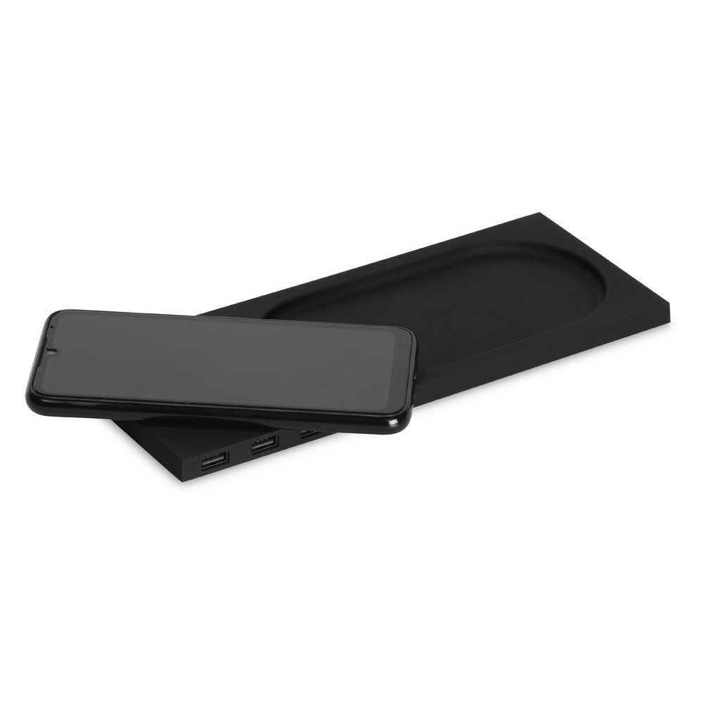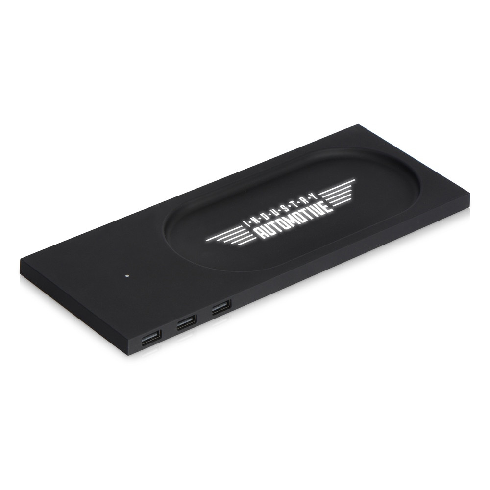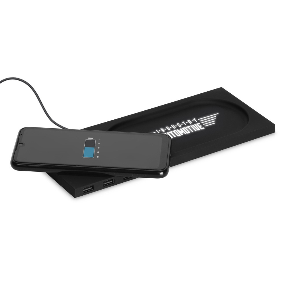 Беспроводное настольное зарядное устройство Glide выполнено из пластика с покрытием soft-touch. Кроме функции беспроводной зарядки имеет также 3 зарядных USB-разъема. Компактный органайзер имеет отсек для мелочи. После гравировки на устройстве вскрывается белый цвет подсветки, что позволяет сделать необычную и стильную персонализацию на этом гаджете.