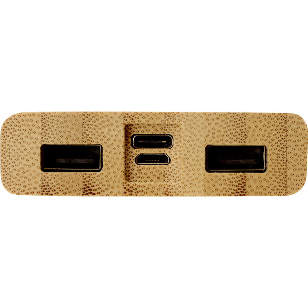 Универсальный повербанк Bamboo Air сочетает в себе современные технологии и натуральный материал. Поддерживает беспроводную зарядку совместимых Qi - устройств. Корпус сделан из 100% натурального бамбука без пластиковых вставок. Экологичный материал не только привлекает внимание, но имеет приятный естественный аромат и удобно лежит в руке. Повербанк имеет два выходных USB разъема, два входных разъема micro USB и USB-C и все необходимые кабели в комплекте (USB-C, micro USB и Lightning / iPhone). Полимерной литий-ионной батареи емкостью 10000 мАч в среднем хватит на несколько зарядок смартфона в зависимости от модели (2,5 -3,5 раза). Поставляется в крафт упаковке из переработанной бумаги.